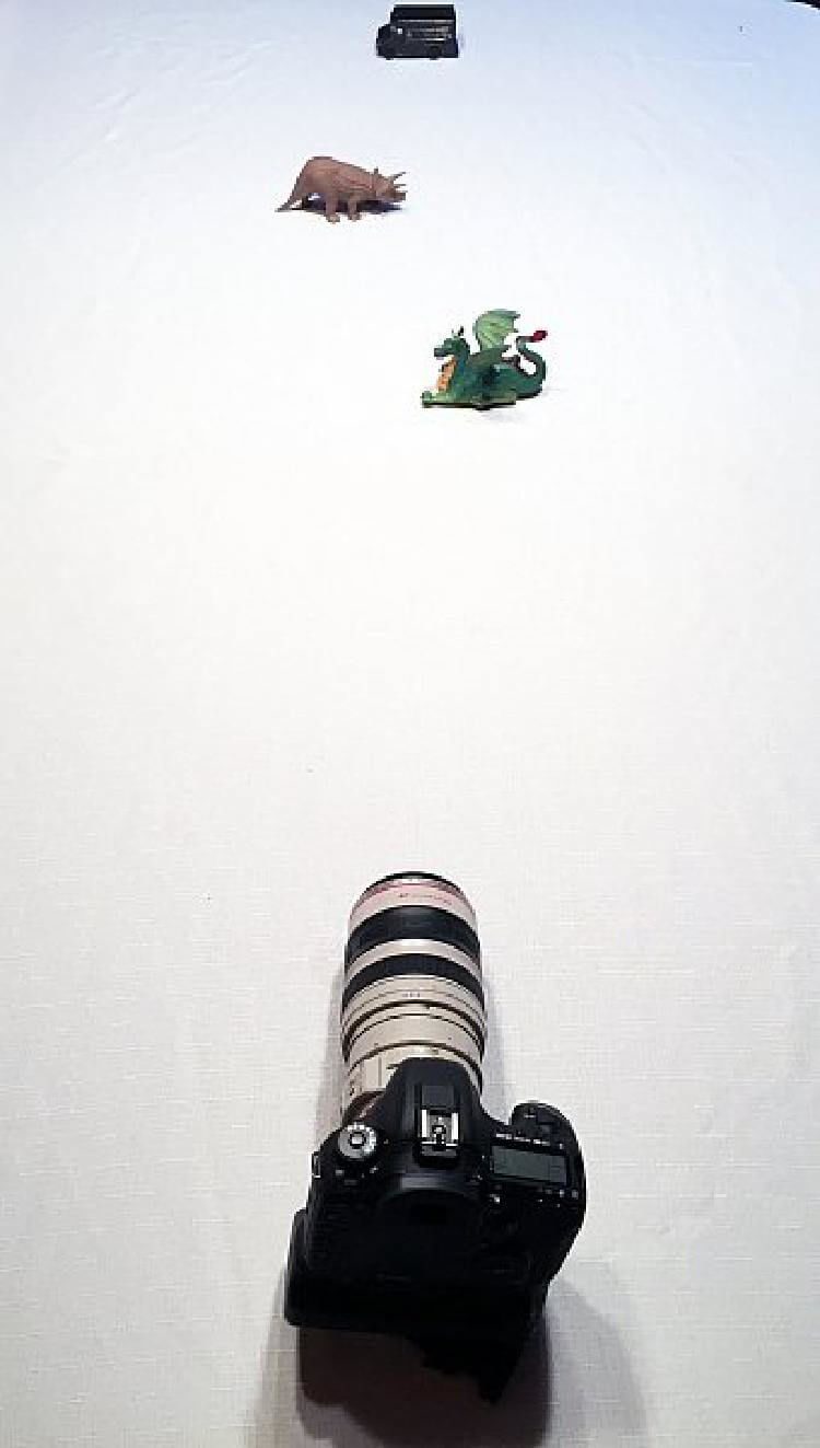 Камера двигаться не будет, поэтому установите её на столе. Первый объект поставьте прямо напротив камеры, на расстоянии примерно в 60 см. Второй объект должен быть на 30 см дальше, третий — дальше ещё на 30 см. Предметы нужно расположить в шахматном порядке, чтобы они попадали в угловое поле объектива. Результат должен выглядеть примерно так.