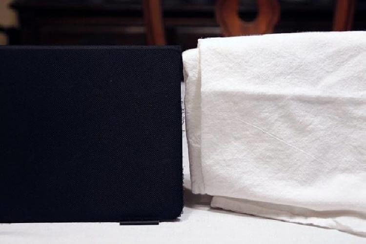 Для задания выберите два объекта. Один — полностью чёрный, другой — полностью белый. Поставьте их вплотную друг к другу. В примере на фото использованы чехол для iPad и полотенце.