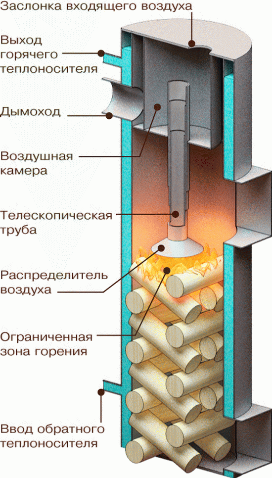 От обычного дровяного котла он отличается очень вместительной топкой – ведь чем больше может поместиться дров, тем дольше они будут гореть. Но главное отличие – это направление горения, если в обычной печи оно происходит снизу вверх, то в котле длительного горения – наоборот, сверху вниз. Этот эффект достигается за счет того, что кислород в камеру сгорания подается сверху – за счет этого интенсивность сгорания существенно снижается, дрова фактически не горят, а активно тлеют. Тем самым время между закладками топлива существенно (до 7-12 часов) увеличивается.