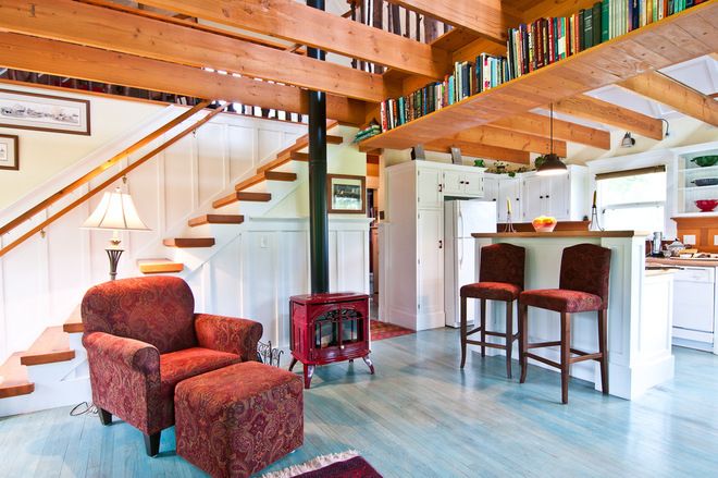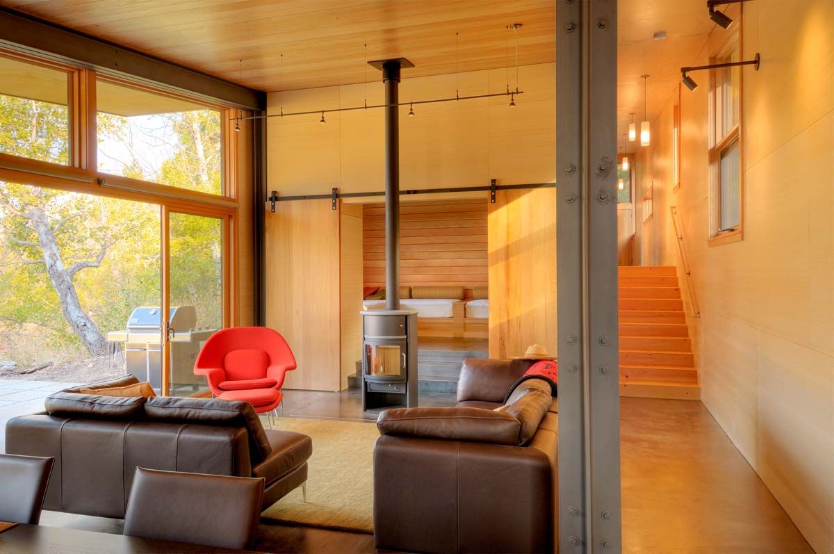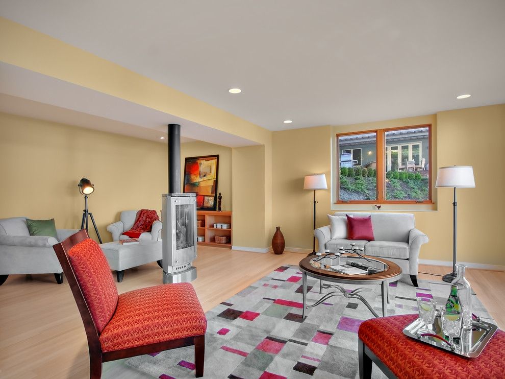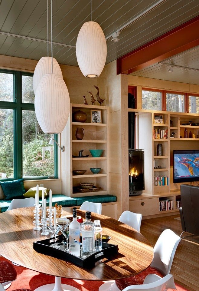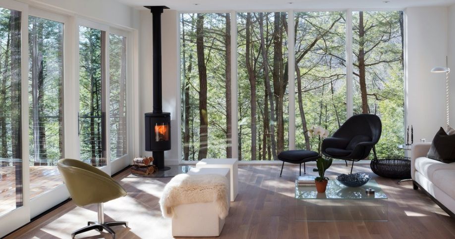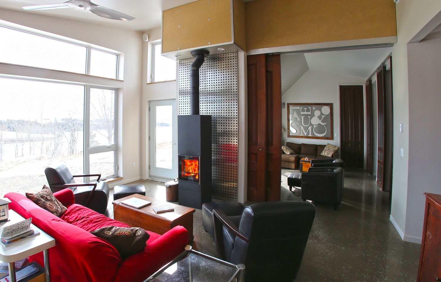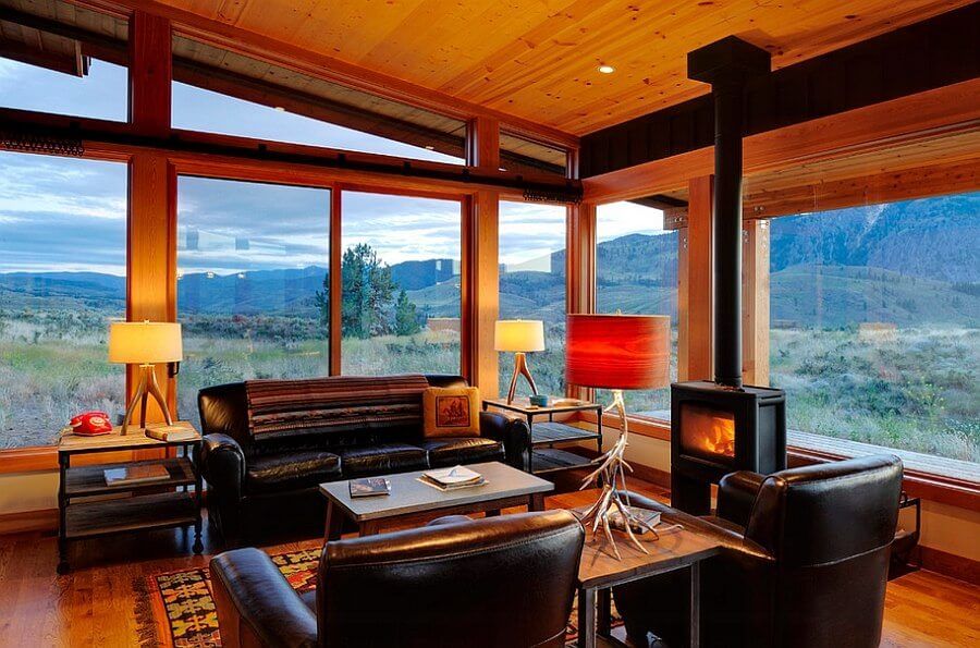 Печь камин длительного горения отлично смотрится в ярком интерьере