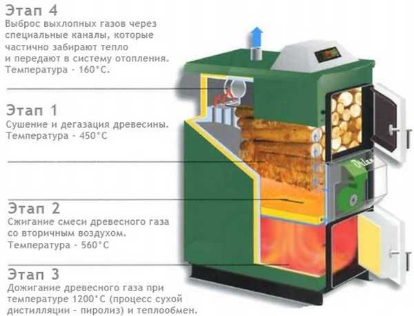 Другое название этого типа котлов – газогенераторные, в основу их работы пиролиз – процесс разложения топлива (дерева) в процессе тления (длительного горения) на горючий газ и твердый уголь. При смешивании с воздухом газ сгорает, выделяя большой объем тепла.