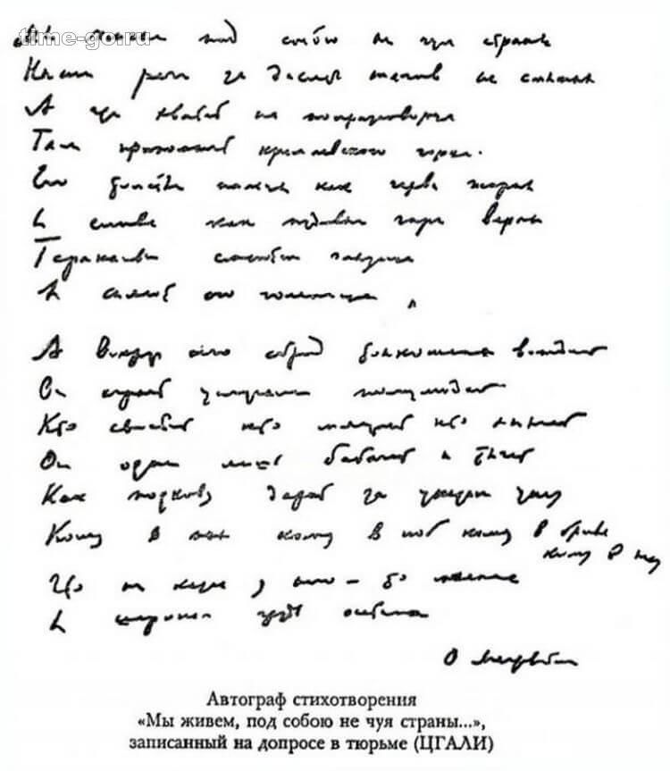 Один из крупнейших русских поэтов XX века в ноябре 1933 года пишет антисталинскую эпиграмму «Мы живем, под собою не чуя страны…» («Кремлевский горец»), которую читает полутора десяткам человек. Борис Пастернак этот поступок называл самоубийством.